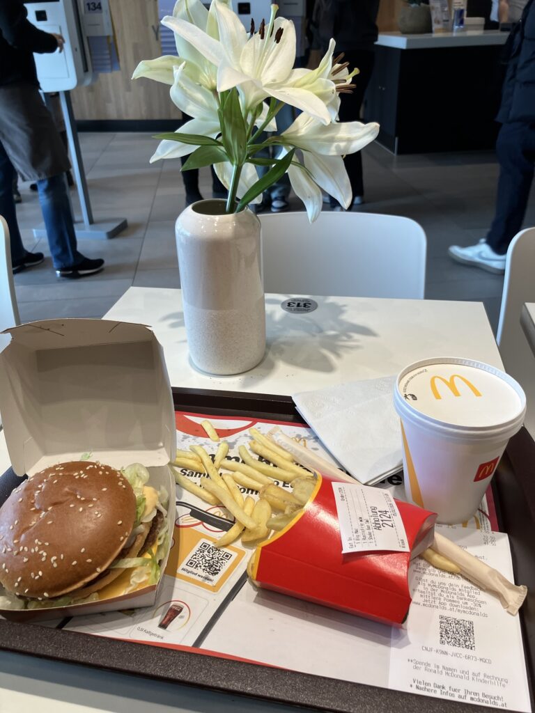 ちょっと面白いなーと思ったのはマクドナルド。地産地消を目指していて、オーストリア産🇦🇹のポテトやお肉などを積極的に利用していると動画で紹介されていました。どうりでポテトがおいしかった😋