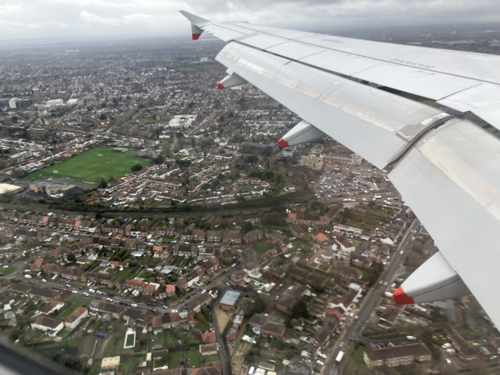 ヒースロー空港近く。よく見ると、どの家も敷地は細長く、2階か3階建ての横幅が狭い家と庭、という組み合わせ。