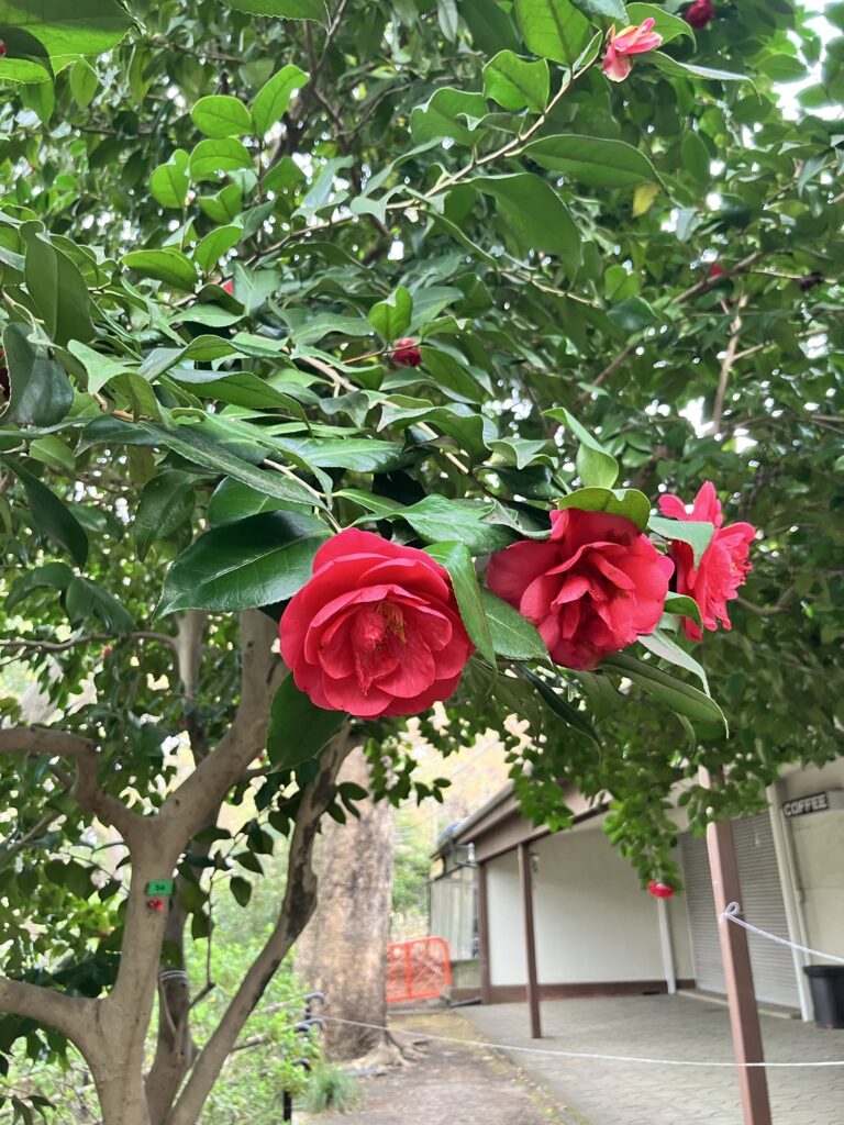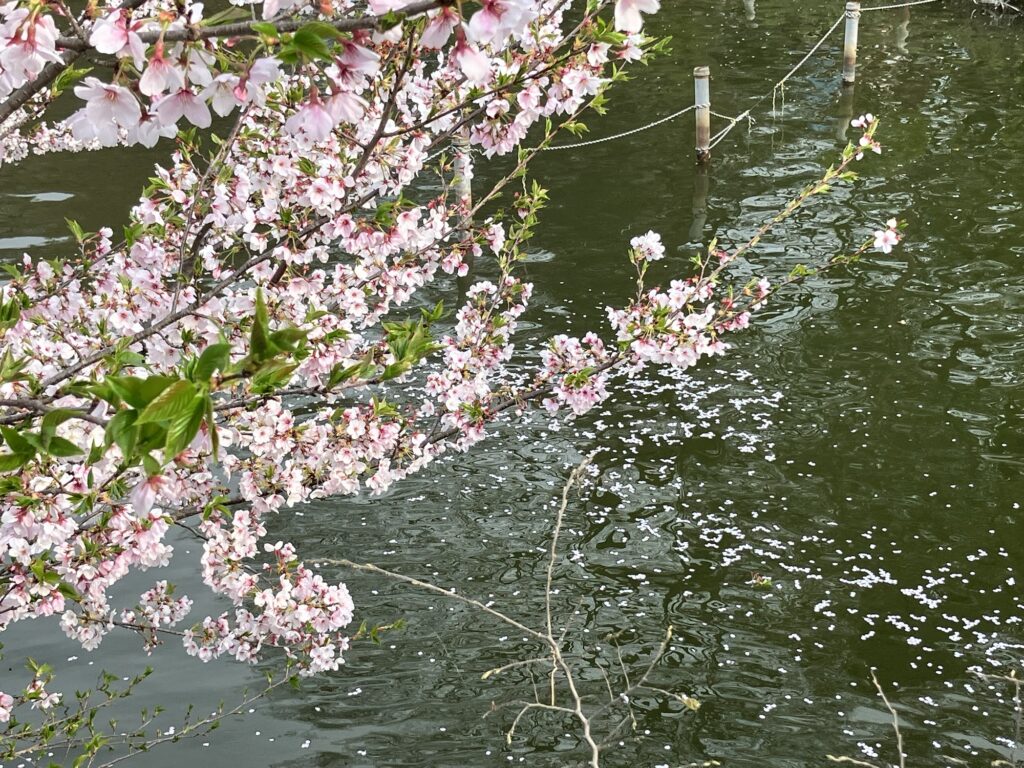 Daily Life 遊び心 2026年3月31日 気がついたら桜は散り始め、花びらは池の水面に行列、若い葉が姿を現していた。椿をちょこんと柵の上に並べたのは、だあれ? 前 オーストリアへ逃避行vol.2